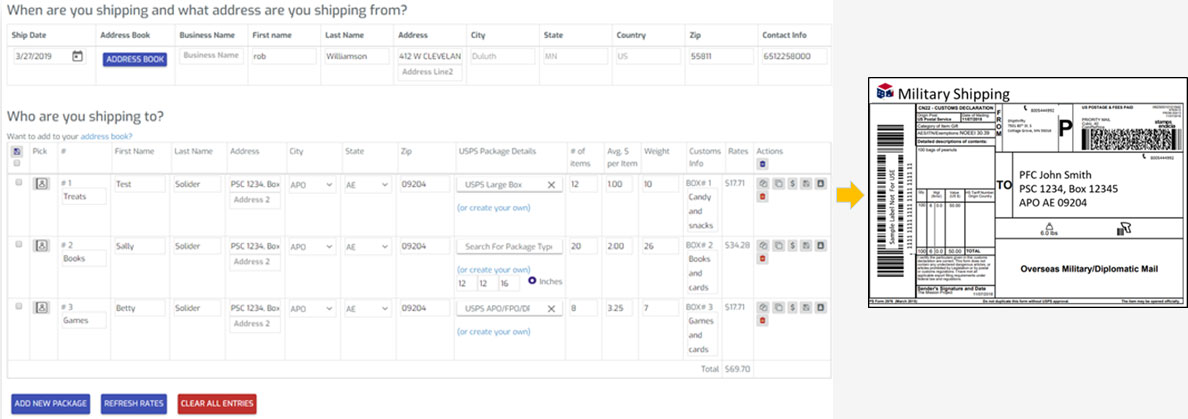 We personally attended events and gotten feedback from those that send care packages to design the best tools for military shipping. Enjoy less data entry with the ability to copy packages and customs forms. Track your packages, batch print labels, filter and export reports, and more.